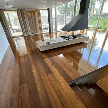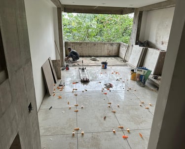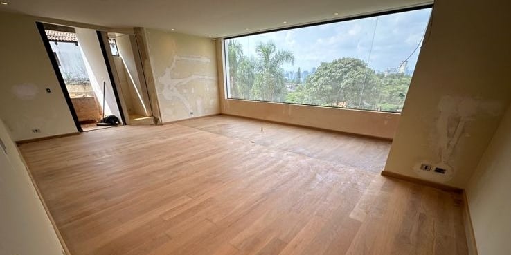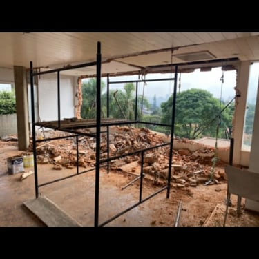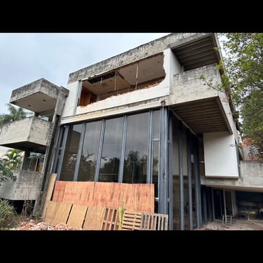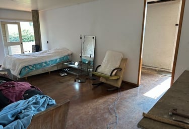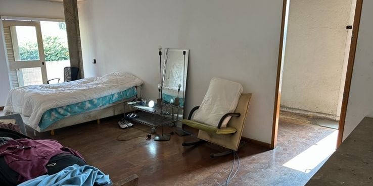 Esta mesma suíte estava em estado de abandono, com goteiras por todo lado e infiltrações no piso, semelhante ao resto da casa